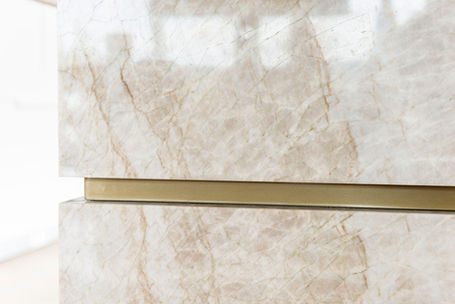 If that magnificent looking stone was not eye catching enough, is gets carved through by decorative brass strips finished to perfection. The detailing continues in the sink area. A white sink is complementing the white cabinet fronts with brass drainer and tap. This look continues into the adjacent scullery/ laundry.